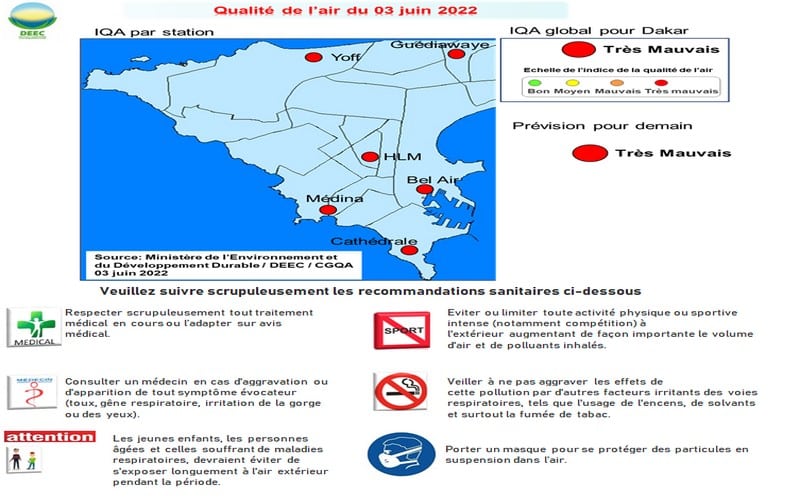 La qualité de l’air à Dakar est très mauvaise pour la journée du 03 juin 2022 avec des concentrations de particules (PM10) qui dépassent 900 microgrammes par mètre cube dans l’air ambiant.